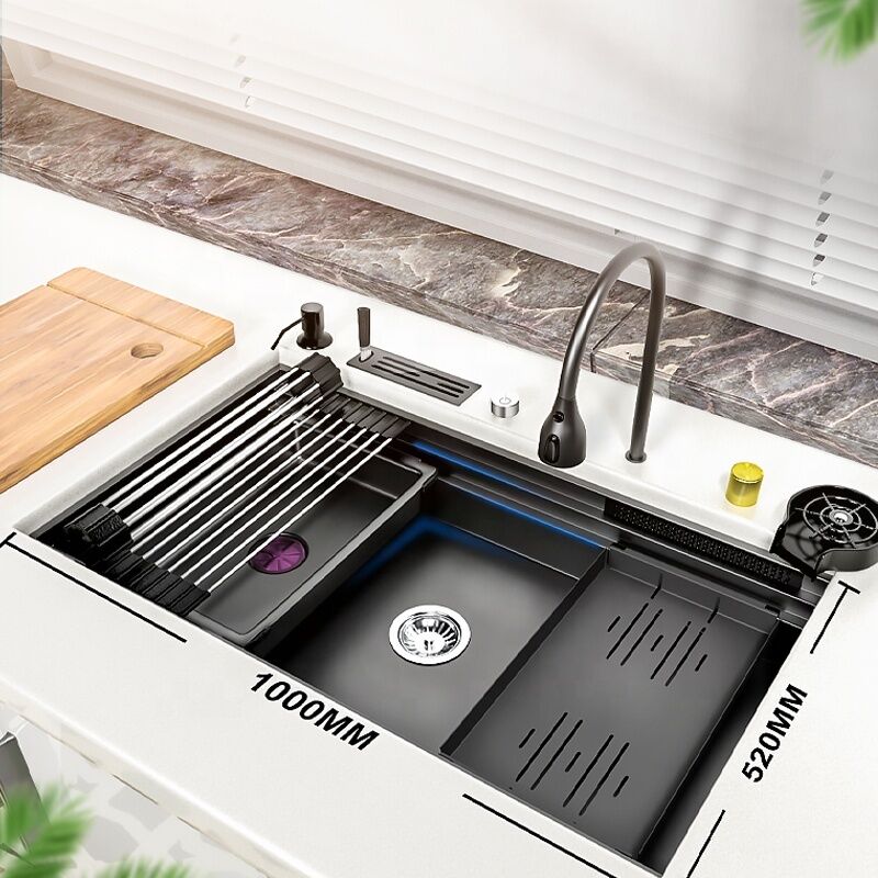 304 Stainless Steel Sink with Waterfall Faucet and Knife Rest and Cup Washer for Farmhouse Kitchen