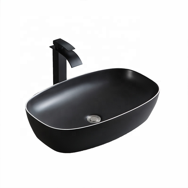 Modern Design Above Counter Black Color White Line Vessel Sinks Bowl Ceramic Hand Wash Basin Matt Black Bathroom Sinks