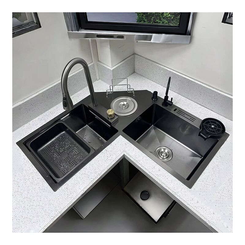 Modern Handmade Stainless Steel Triple Bowl Kitchen Sink Nano Multi-Functional Corner Vegetable Wash Basin Black Basin Counter