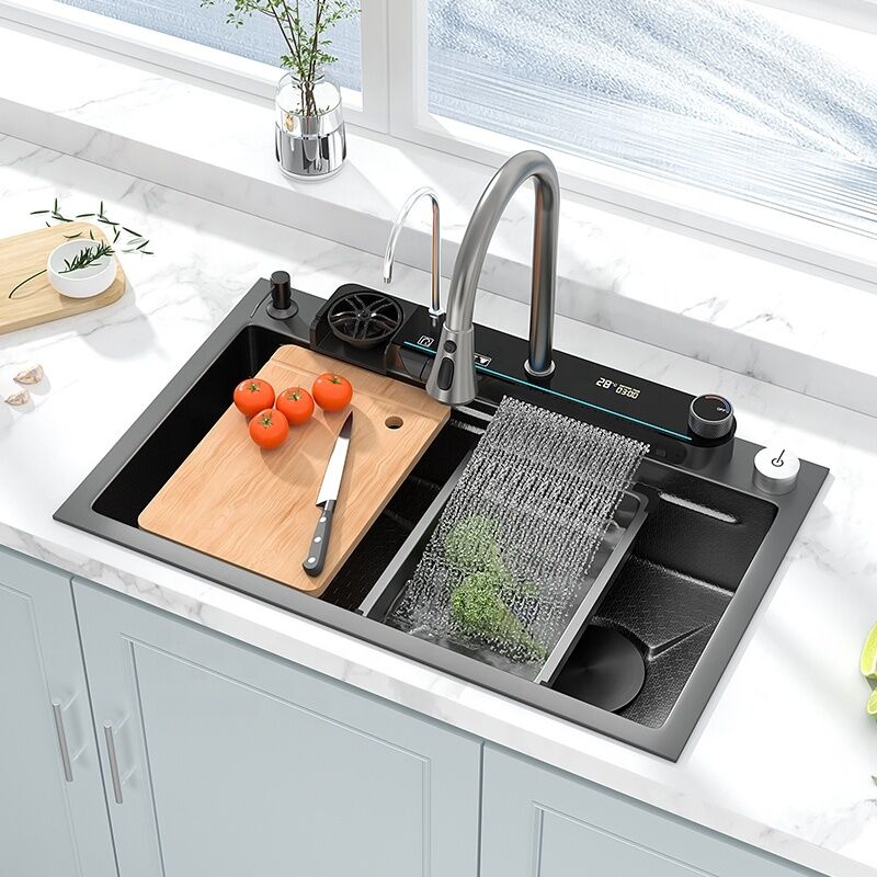 Smart Handmade Stainless Steel Waterfall Multifunction Kitchen Rectangular Nano Black Single Bowl Faucet Workstation Undermount