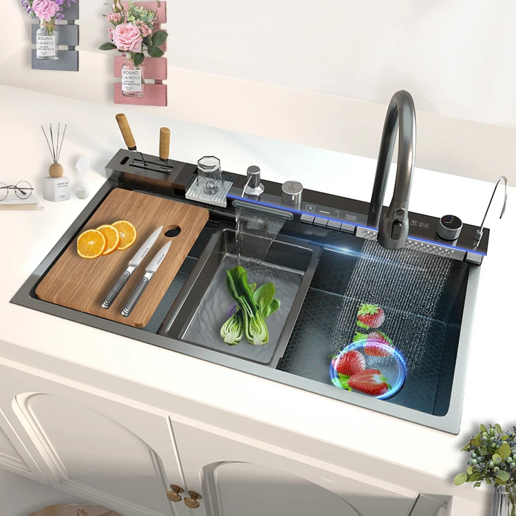 March Expo 2025 Hot Sale 88X48CM Smart Kitchen Sink with Stainless Steel Knife Holder and Waterfall Faucet for Apartment Kitchen