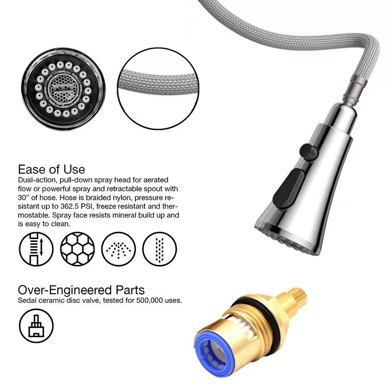 | Característica | Caño giratorio de 360 grados Control de temperatura y agua con una sola palanca La placa de cubierta está disponible para instalación de 1, 2, 3 o 4 orificios La manguera desplegable trenzada de nailon se extiende hasta 25 pulgadas La manguera desplegable autoretráctil mantiene el cabezal rociador acoplado y seguro cuando no está en uso Presión de agua probada para el estándar de la industria. El grifo monomando se mueve 90 grados hacia adelante para adaptarse a espacios reducidos El acabado premium resiste el óxido, la corrosión y el deslustre. El grifo de cocina con rociador de doble función ofrece un flujo aireado o un rociado potente Construcción de latón macizo con acabado en oro cepillado mate. Todos los accesorios de montaje y líneas de agua fría/caliente incluidos. Medidas del grifo Alcance del pico: 9 ¼” Altura del grifo: 18″ Conexiones de plomería estándar de EE. UU. de ⅜” |