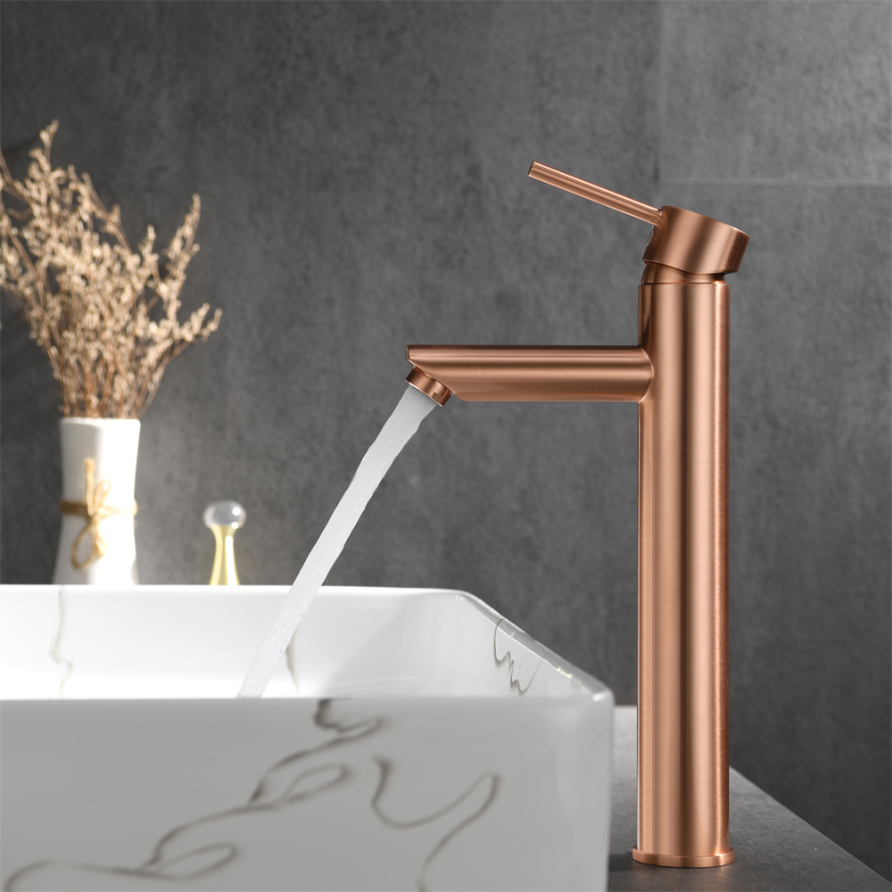 Hot Cold Water Supply Deck Mounted High Wash Basin Faucet Brushed Rose Gold Finished Brass Single Hole Bathroom Basin Tap