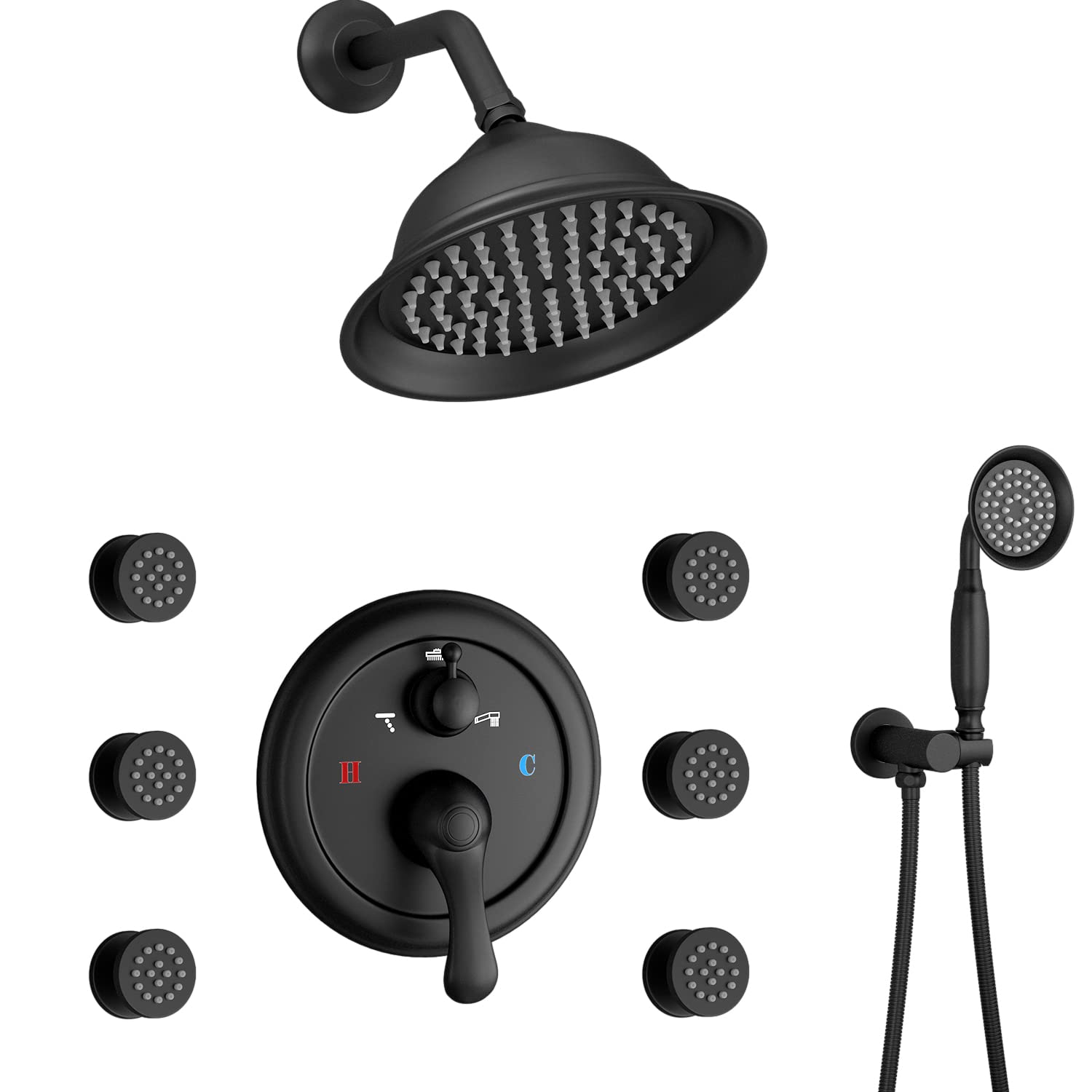 European Style Matte Black Shower Faucet Set 8 Inch Shower Jets Body Sprays System High Pressure Shower Head Set