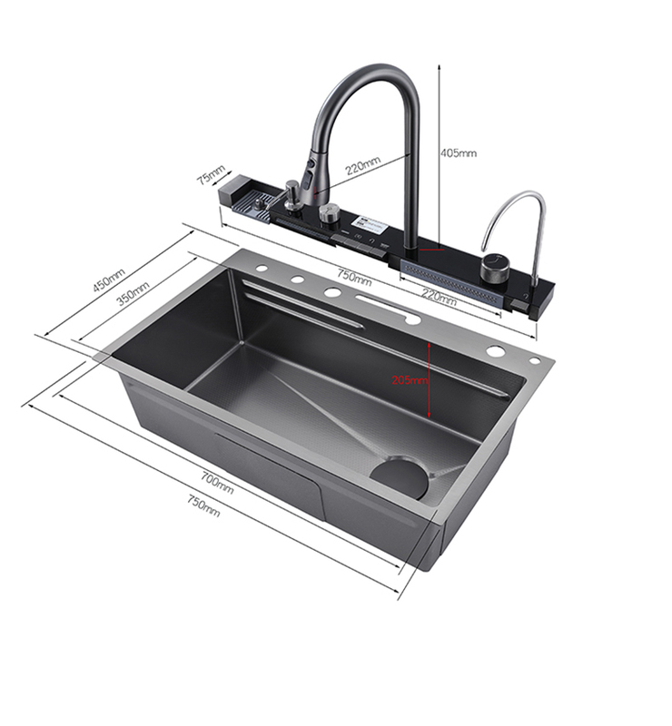 304 Stainless Steel Single Bowl Kitchen Sink Waterfall Style with Temperature Display Pull-Out Faucet Four Holes