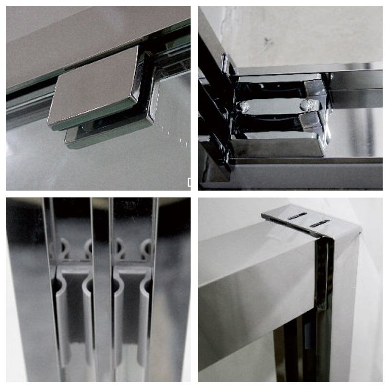 La porte de douche en verre est principalement composée d'un cadre de porte, d'un vantail de porte, de pièces de transmission, de pièces de culbuteur, d'une tige de transmission, d'un dispositif directionnel de porte de douche, etc. Le type peut être installé à l'intérieur. Chaque porte de douche en verre a deux portes ou des portes simples. La bordure d'un côté du vantail de porte latéral est relié au vantail de porte central par des charnières. Shower Door offre une grande variété de portes de douche coulissantes. et une porte de douche battante est également disponible. Chaque style a ses propres applications uniques et peut être configuré avec des barres à serviettes, des poignées, des boutons ou des poignées.