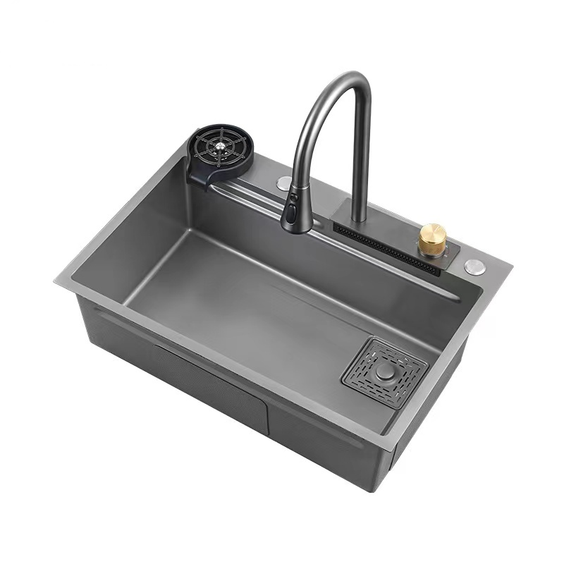Handmade Stainless Steel Kitchen Sink SS304 Full Set Kitchen Accessories Waterfall Faucet Flying Rain Basin Design One Three