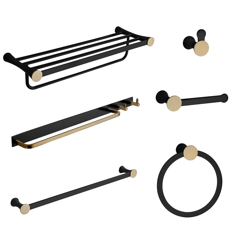 Luxury Bathroom Design Wall Mount Black Gold Brass 6 Piece Bathroom Accessories Set