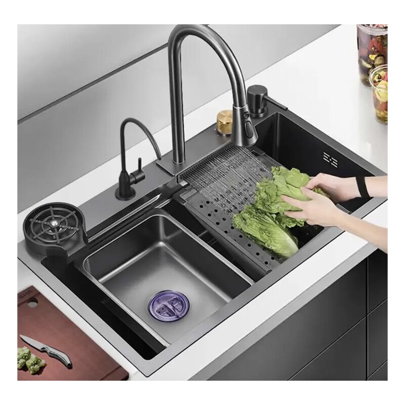 Luxury Kitchen Sinks Multifunctional Sink Modern Waterfall Rainfall Single Bowl Kitchen Sink Set Black 304 Stainless Steel China