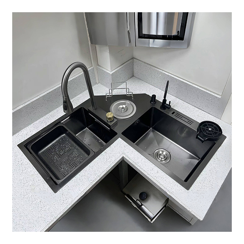 Modern Handmade Kitchen Sink Corner Vegetable Wash Basin Black Nano Multi Functional Sink Double Sink