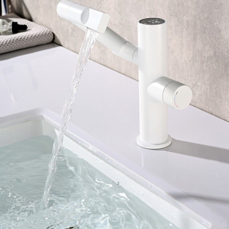 Luxury Bathroom Sink Faucet Digital Waterfall Basin Mixer Faucet Deck Mounted White Rotating Vanity Faucet