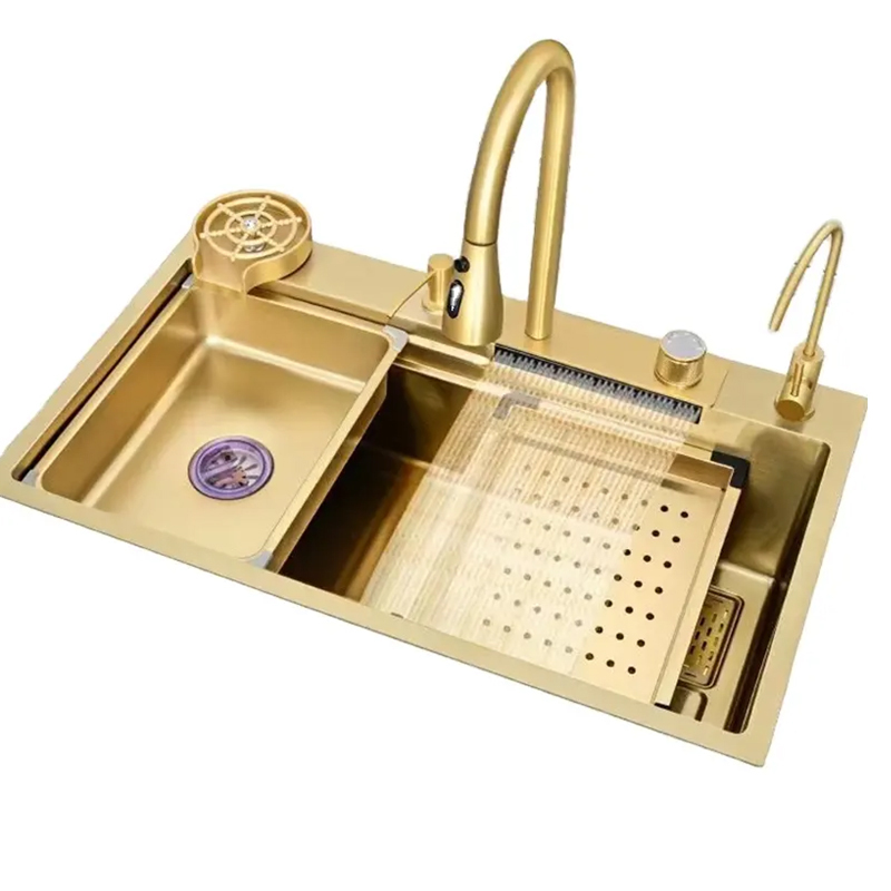 Multifunction Kitchen Sinks 304 Stainless Steel Kitchen Sink Faucet Modern Gold Waterfall Rainfall Single Bowl Kitchen Sink Set