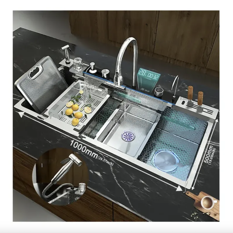 New Trending Customized Smart Kitchen Stainless Steel Sink Multifunction Waterfall Right Outlet Large Single Bowl Sink