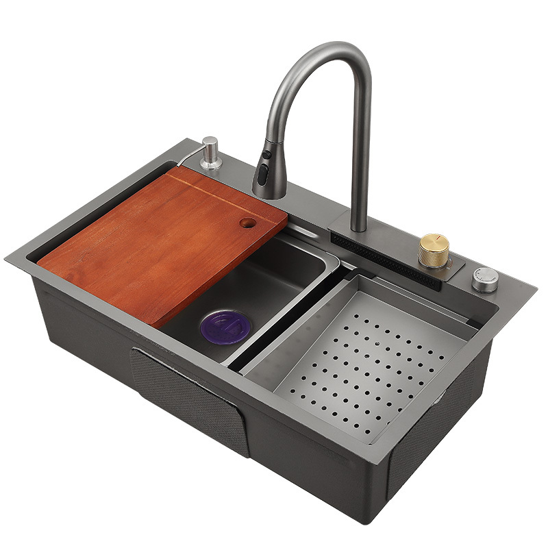 Complete Whole Set Waterfall Kitchen Sink Stainless Steel Sink Nano Black Single Bowl With Dish Rack Under Mount Sink