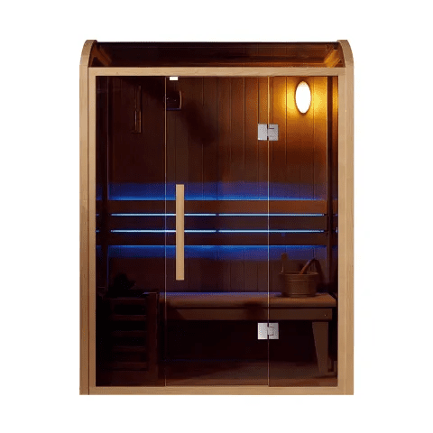Sauna moderna com chuveiro a vapor seco para interiores e aquecimento elétrico.