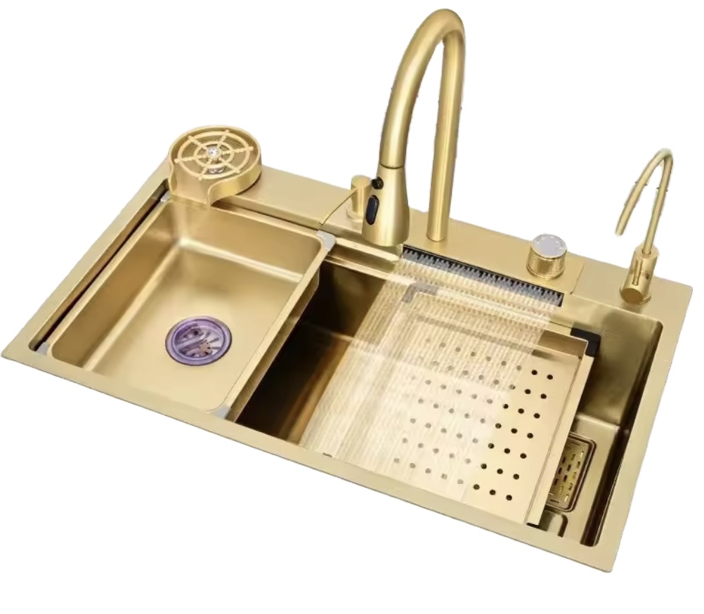 Modern Single Bowl Kitchen Sink with Gold Handmade Under Mount Waterfall Faucet Nano Stainless Steel Smart Design