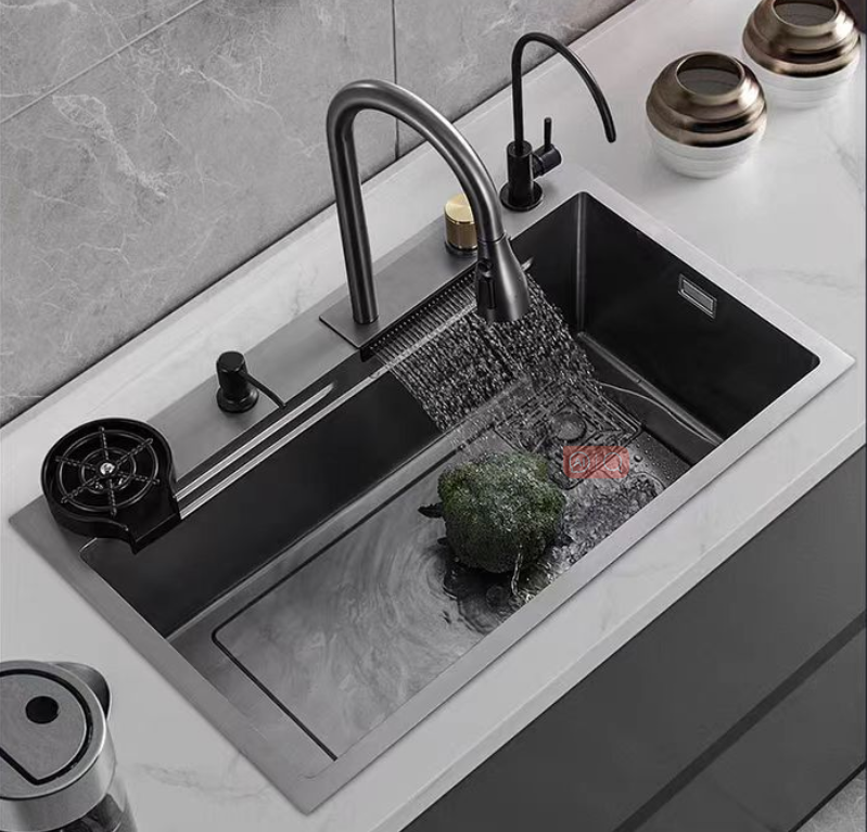Multifunction Kitchen Sink 304 Stainless Steel Kitchen Sink Modern Black Double Rainfalls Single Bowl Kitchen Sink