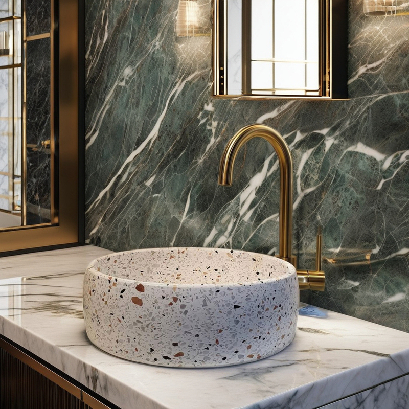 New Terrazzo Solid Sink Non-Porous Mosaic Vessel Sink Waterstone Pedestal Basin Wash Hand Basin with Drainer for Bathroom