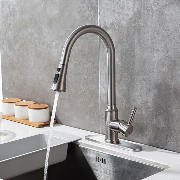 Torneira de cozinha com pulverizador pull down de níquel escovado, torneira de pia de cozinha de alça única de arco alto