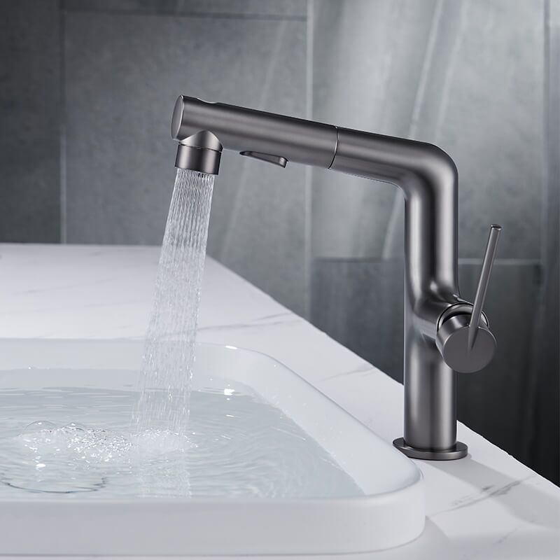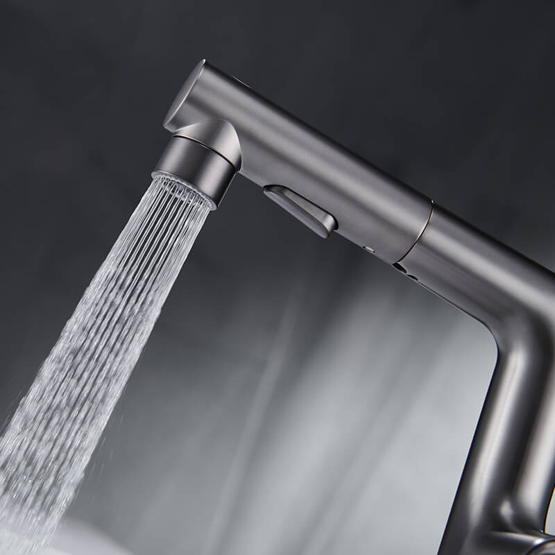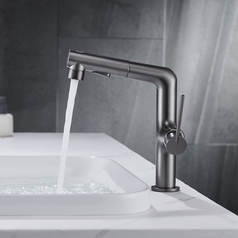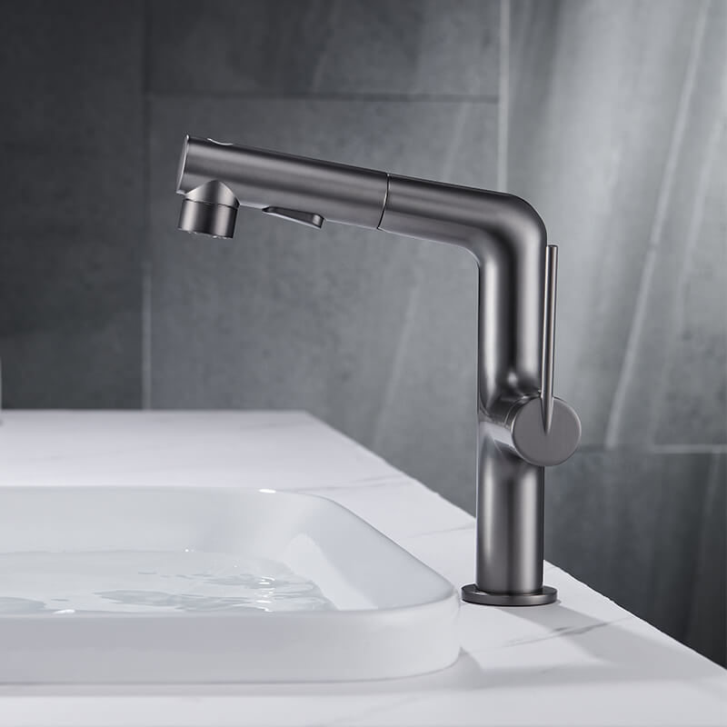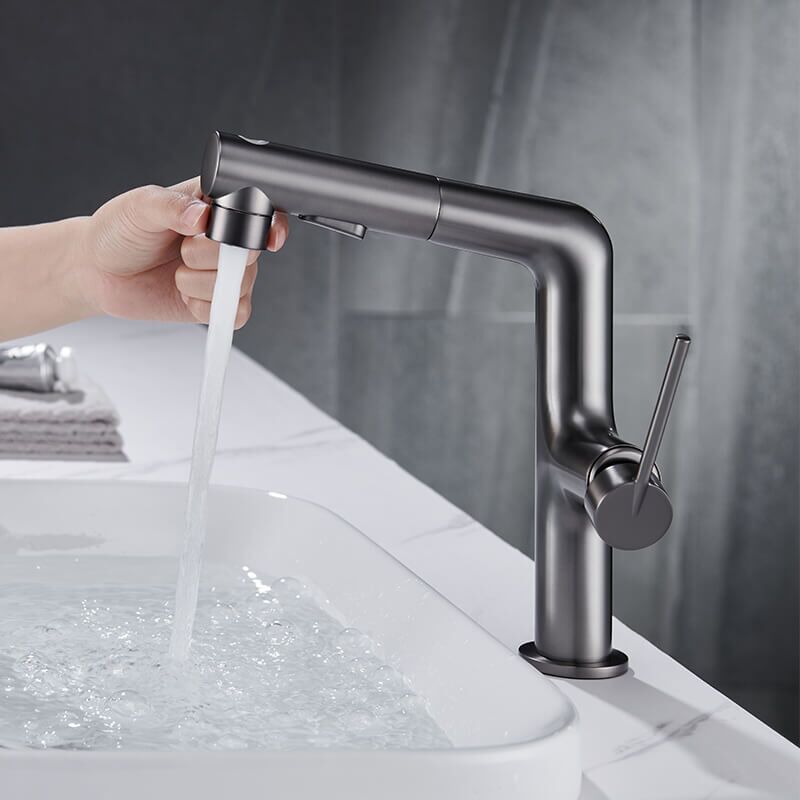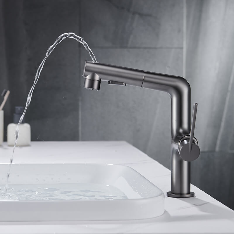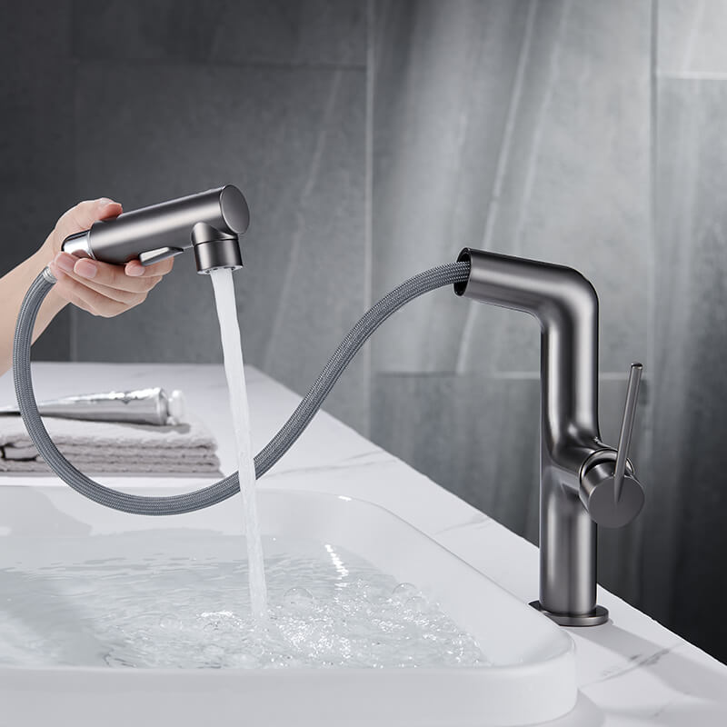 The single-hole pull-out bathroom faucet presents people’s wisdom. This design is a truly innovative faucet. There is no doubt that a gunmetal grey/gold/mate black/chrom finish incorporates perfectly into all decorations in your bathroom. 3 functional bathroom sink faucets and pull-out designs with long hoses that reach beyond the sink bring great convenience to your washing. Just press the button, and you will enjoy 3 kinds of water experiences, fountain, stream, or spray. Constructed from solid brass materials, the bathroom faucet is durable and drip-free. Choosing high-quality material will help you and your family safe from Chemicals.